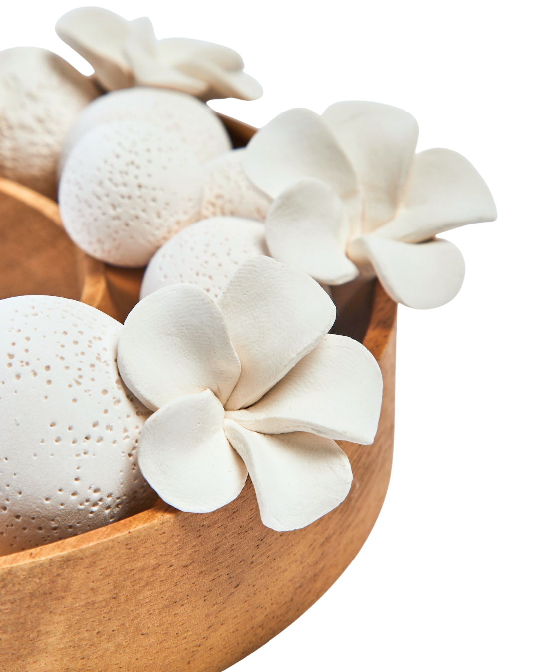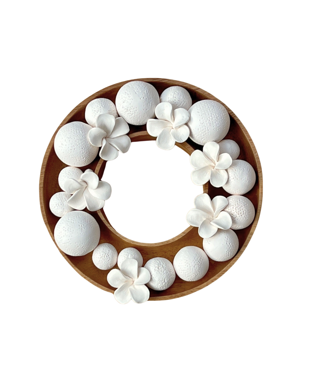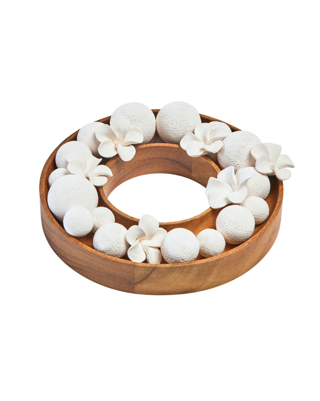 Transforme a atmosfera do seu lar com o Difusor de Fragrâncias Moyo, uma peça que combina a beleza natural com a funcionalidade de um difusor de ambiente de alta qualidade. Este difusor é composto por esferas e flores de cerâmica branca delicadamente dispostas sobre um prato redondo de madeira natural de acácia, criando um design ecológico e estético que decora os seus espaços com os seus materiais e cores naturais.